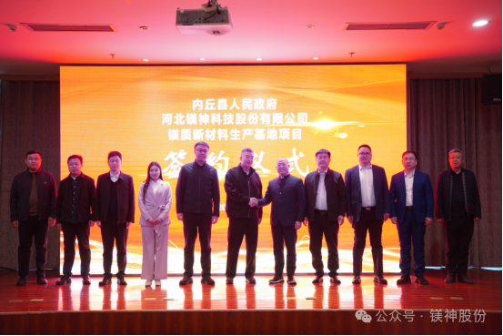 2025年3月28日,河北鎂神科技股份有限公司與內丘縣人民政府在阿爾卡迪亞酒店悅盛廳隆重舉行鎂質新材料生產基地項目簽約儀式。該項目總投資20.25億元,選址邢臺市內丘縣工業園區,致力打造世界..