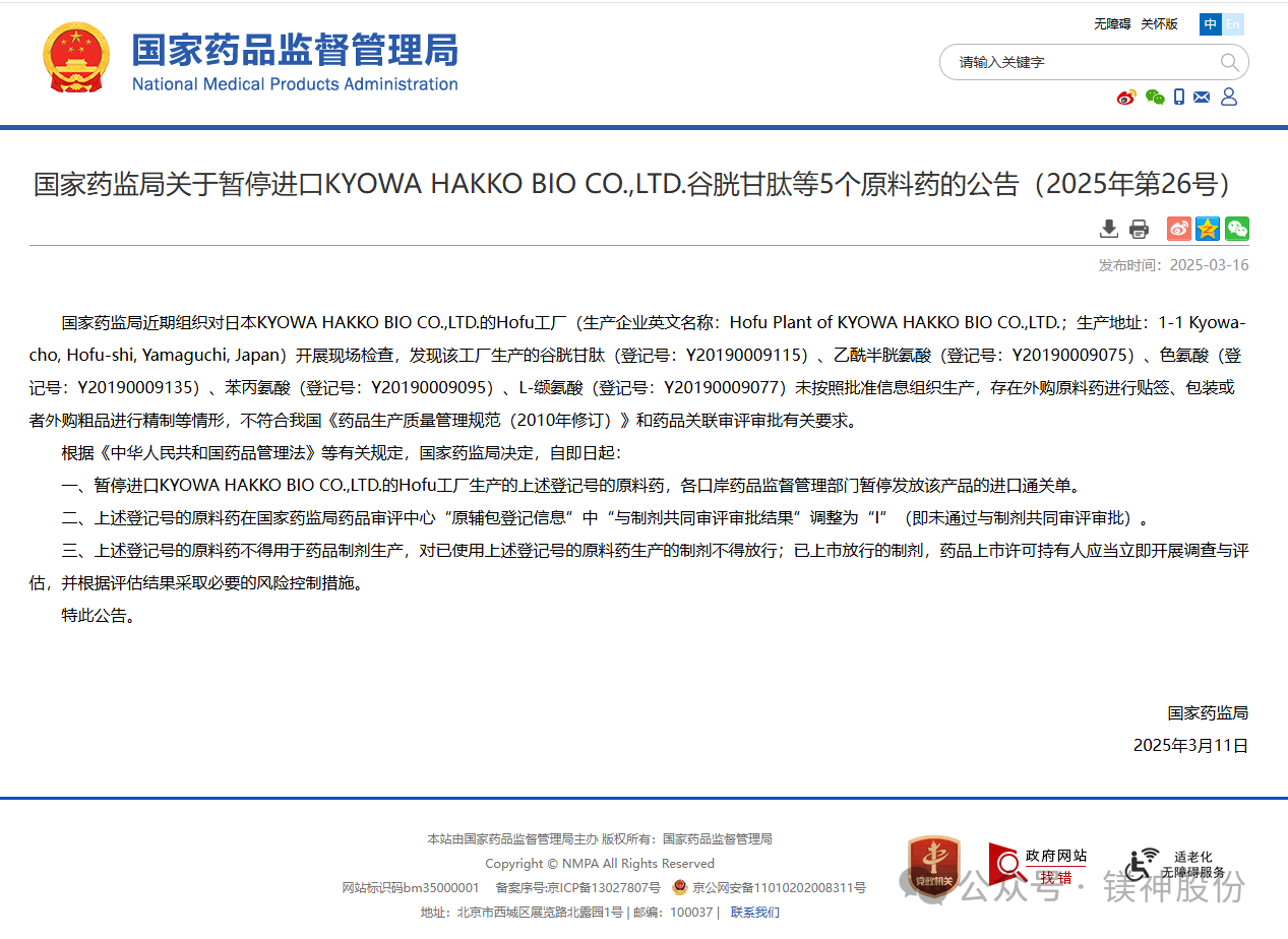 近日,國家藥監(jiān)局發(fā)布重要公告,宣布暫停進(jìn)口日本KYOWA HAKKO BIO CO.,LTD.(協(xié)和發(fā)酵株式會社)生產(chǎn)的谷胱甘肽等5個原料藥。這一決定源于該公司的Hofu工廠在生產(chǎn)過程中存在..