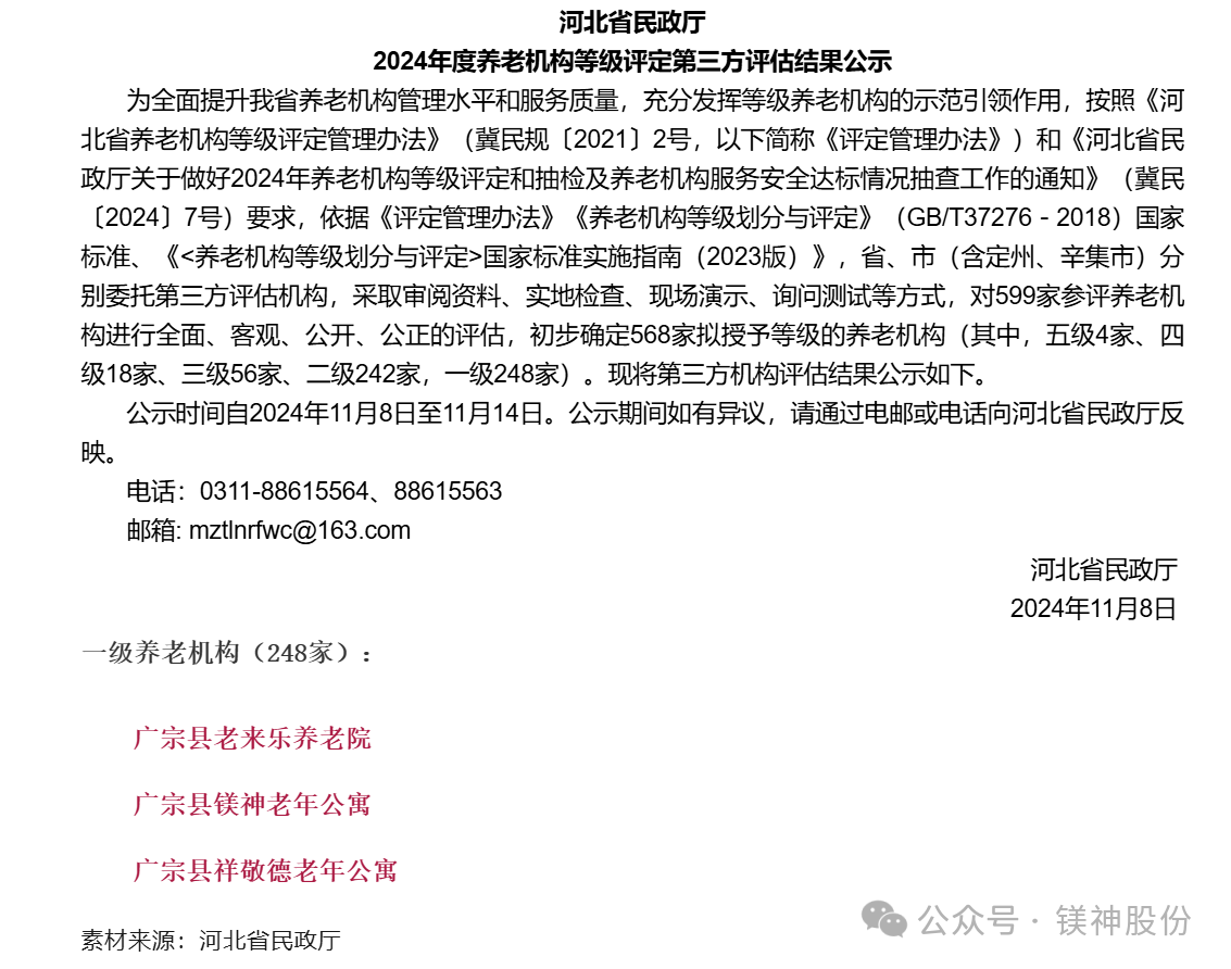 鎂神科技旗下鎂神老年公寓獲河北省一級養老機構