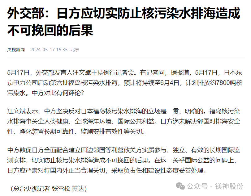 長期以來,這些企業采用“海水法”以海水中的鎂成分為主要原料,制造銷售鎂鹽產品。而鎂鹽在工業中廣泛應用,如樹脂穩定劑和阻燃劑等工業用產品、抑酸劑和功能性輔料等醫藥、食品用產品。這些產品作為環境友好、安全性高的產品在國內外廣泛使用。然而,日本自核污水排海后已發生多起“因食用當地海鮮引起食物中毒”、“當地海灘上出現大量異常死亡海鮮”類似事件,同樣是來自于海水的日本鎂鹽其對人類的危害程度可想而知。